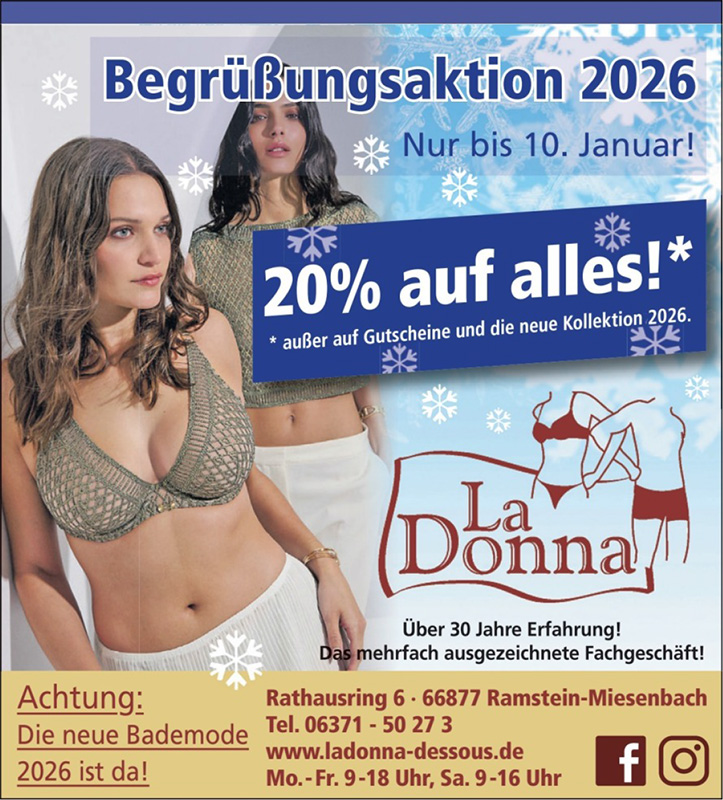 Schnappen Sie sich Ihren Nachlass mit Ihrer personalisierten LaDonna Card. Mit der kostenlosen Bonuskarte erhalten Sie für Ihren Einkauf ab 30,- € Treuepunkte. Sobald Ihre Karte voll ist, erhalten Sie auf Ihren nächsten Einkauf einen Nachlass von 30,- €.